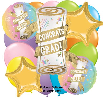 This Scroll Graduation Balloon Bouquet features a giant Scroll balloon with the text " Congrats Grad". Two matching round balloons with the text "Congrats Grad" Compliment this boquet. To make the bouquet even greater we add 12 latex balloons in matching pastel colors, (OR YOUR SCHOOL COLOR LATEX BALLOONS UPON REQUEST)and your Grad balloon bouquet is complete.